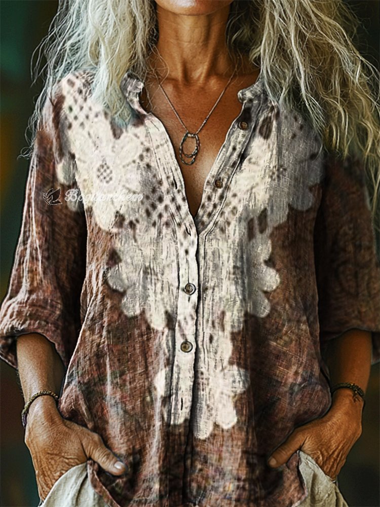 Women's Vintage Lace Floral Art Print Casual Cotton Linen Shirt