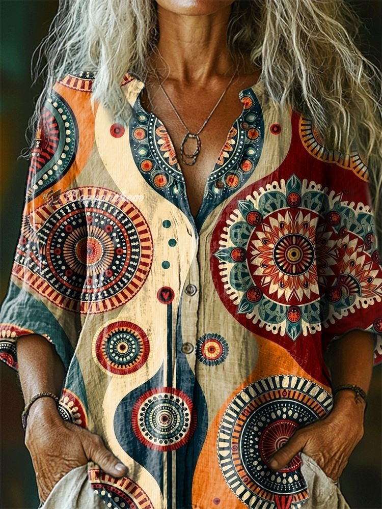 Women's Vintage Mandala Pattern Art Print Casual Cotton Linen Shirt