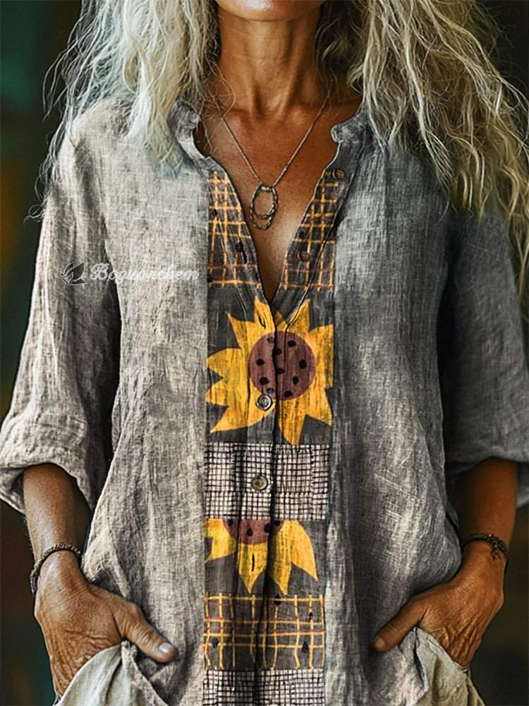 Women's Vintage Sunfloral Art Print Casual Cotton Linen Shirt