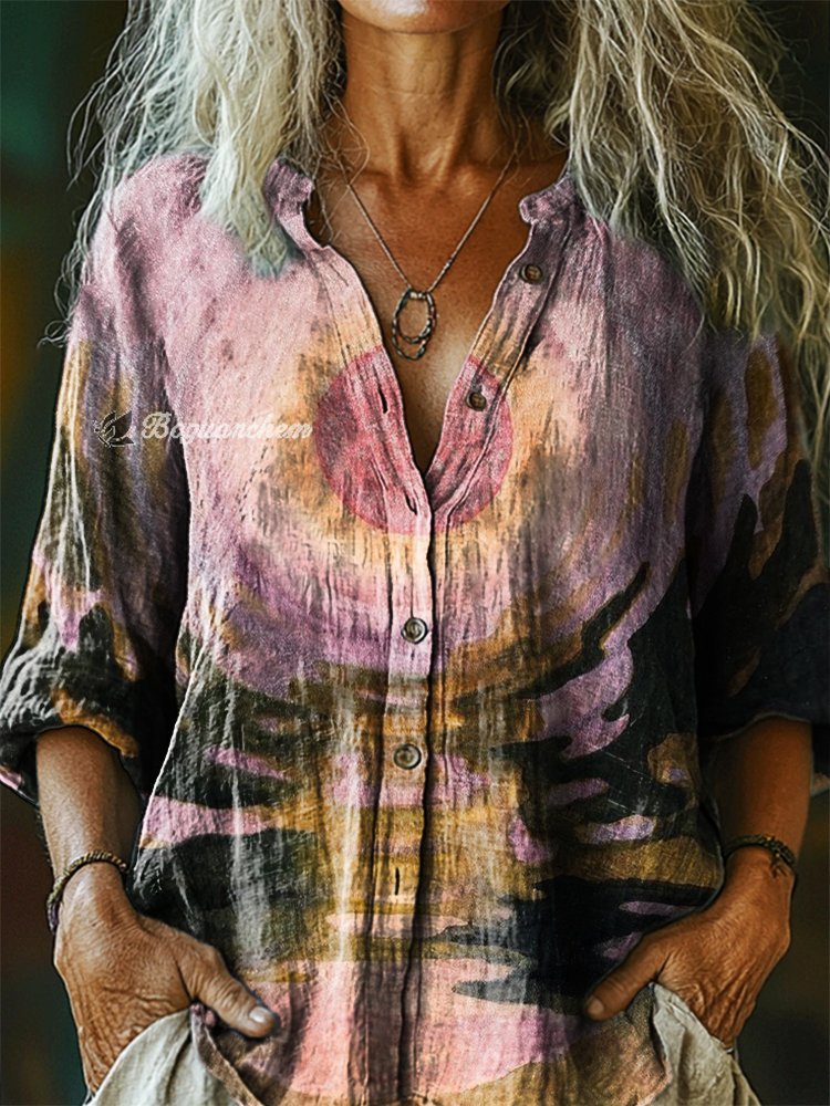 Women's Vintage Sunrise Art Print Casual Cotton Linen Shirt