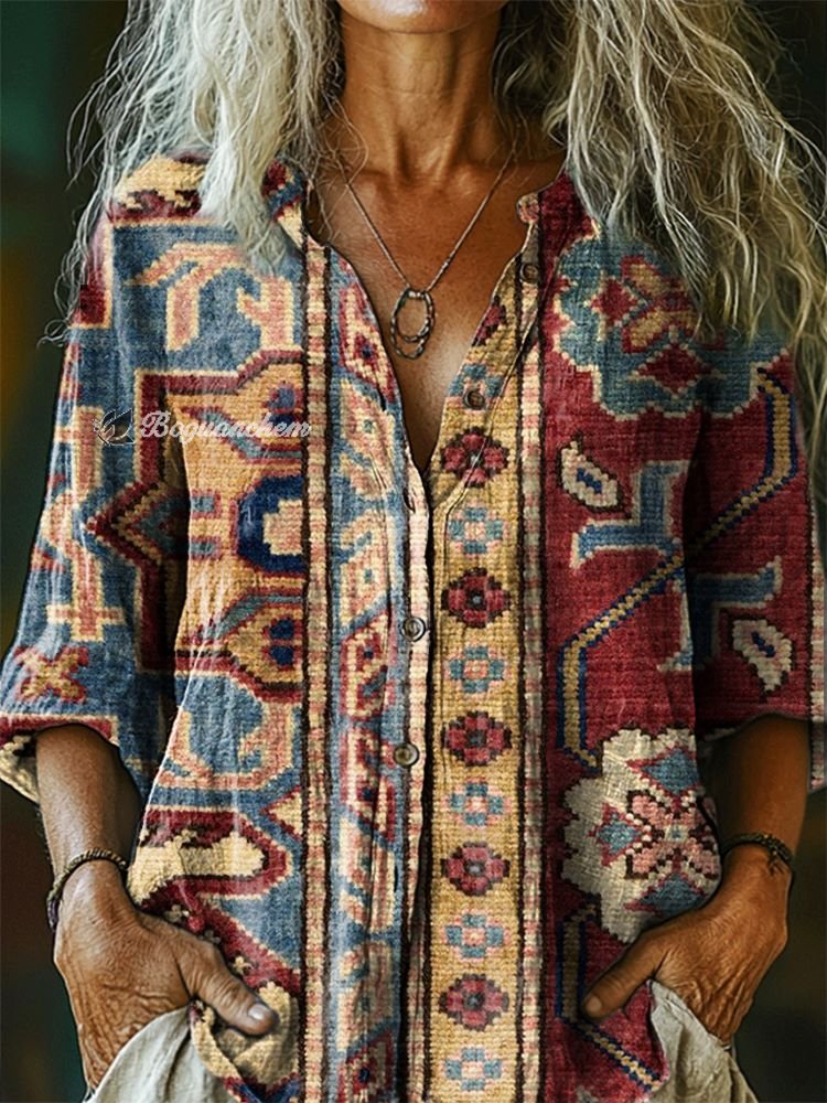 Women's Vintage Tattoo Patchwork Pattern Art Print Casual Cotton Linen Shirt