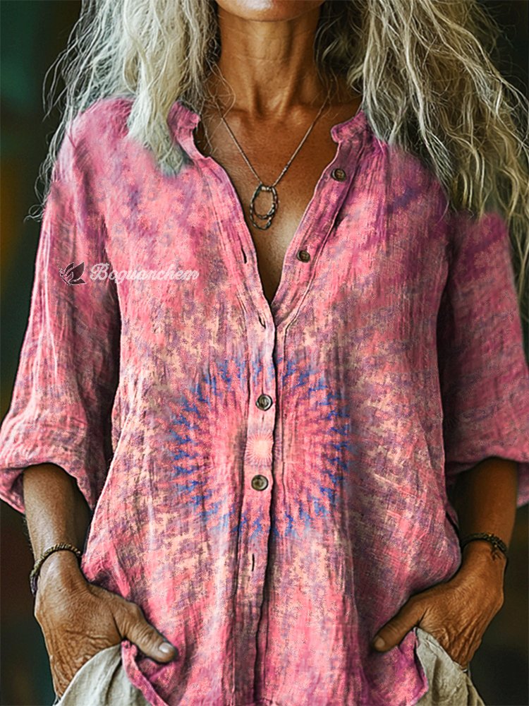 Women's Vintage Tie Dye Art Print Casual Cotton And Linen Shirt