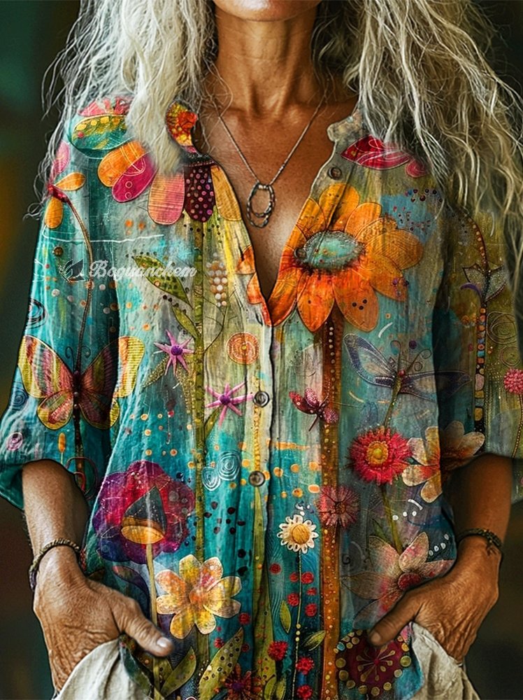 Women's Watercolor Flower Art Print Casual Cotton Linen Shirt